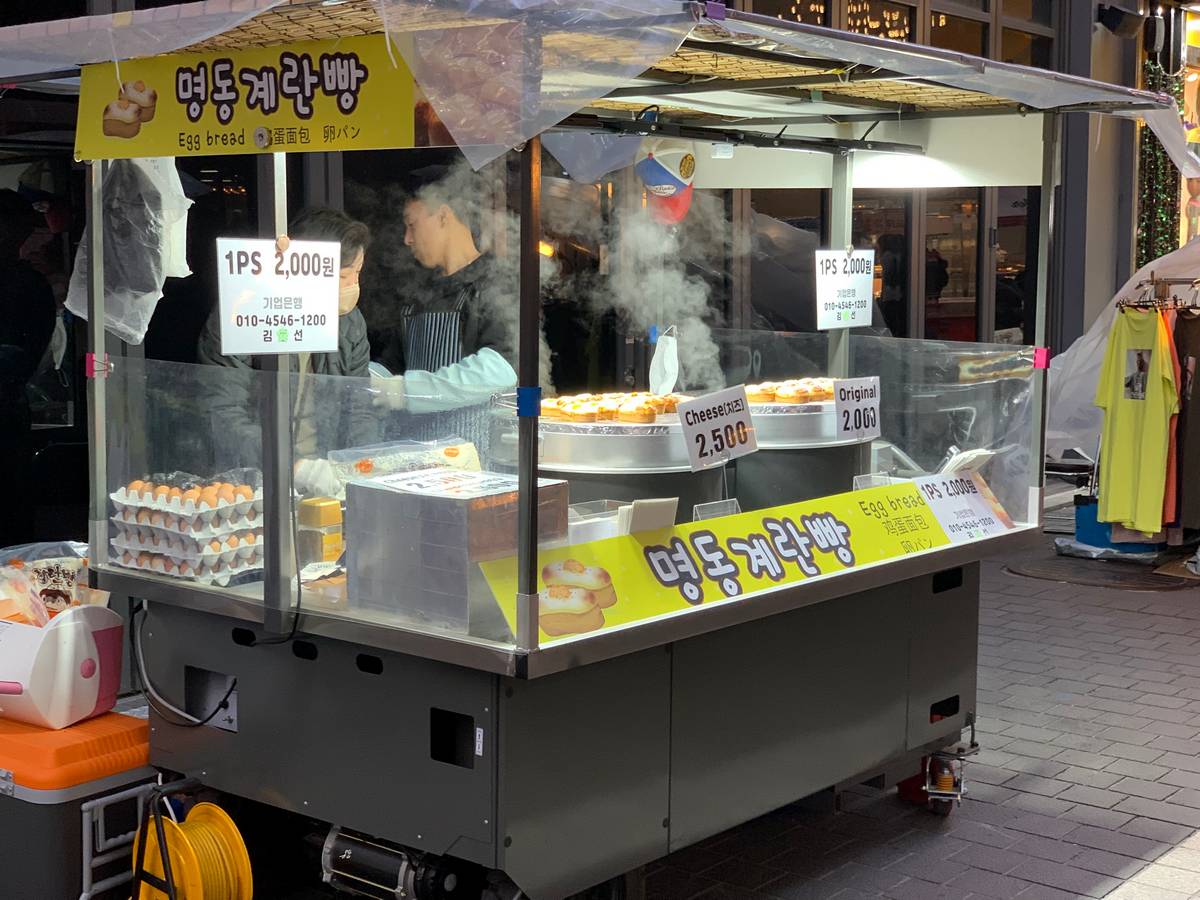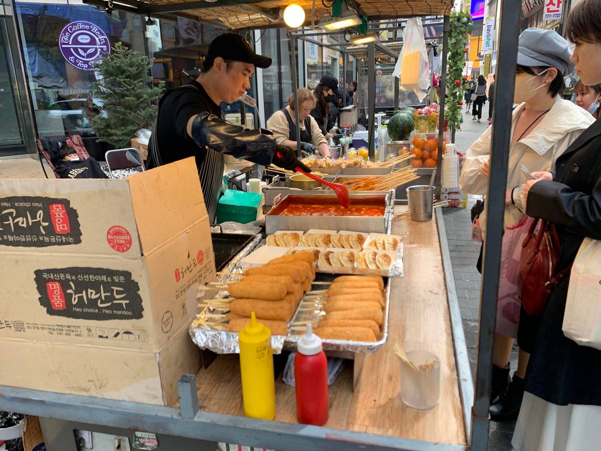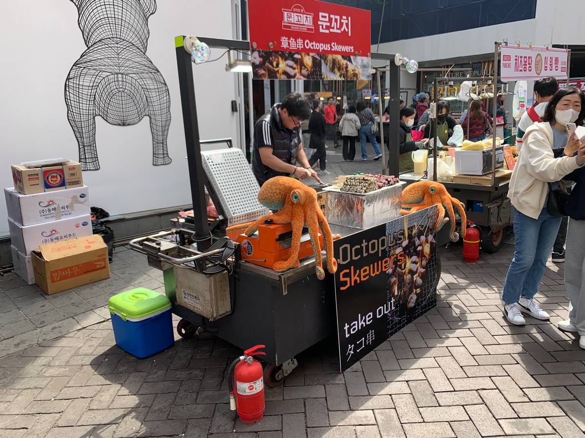 - Comida callejera. Definitivamente hay que probarla, y con toda seguridad de una preparación higiénica. Venden fideos, pan relleno de queso (el queso es caro en Corea del Sur), pulpo, cangrejo, queso con salchicha, pan dulce caliente relleno con mieles y otro montón de comidas. Por lo general resulta económico comer en la calle.