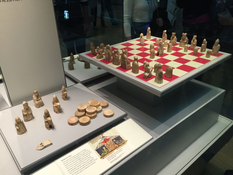 - Juego de ajedrez (Lewis Chessmen, sala 40). Antiguas piezas de ajedrez hechas a mano alrededor del año 1200.