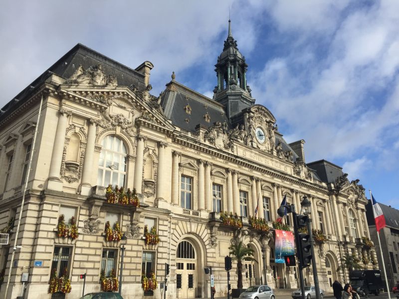 Continuamos hacia el este hasta llegar a la gran Rue Nationale. Agradable calle comercial llena de comercios. Seguimos esta calle hacia el sur hasta llegar a la Plaza Jean Jaurès. Ahí logramos ver el bello Palacio de Justicia y el Ayuntamiento de la ciudad.