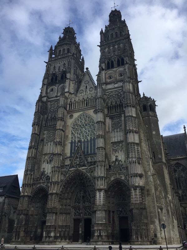Luego continuamos hacia el este por el Boulevard Heurteloup, caminando por el centro de la calle entre los árboles. Continuamos hasta llegar a la Rue Jules Simon. Seguimos esa calle hacia el norte hasta llegar a la espectacular Catedral de Tours. Un edificio impresionante. Una de sus torres parece estar viendo a los que pasan por ahí. En otras palabras, esta Catedral es una visita obligada, al menos por fuera.